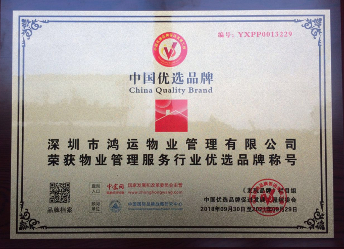 2018年9月30日,鴻運物業(yè)被評為物業(yè)管理服務(wù)行業(yè)優(yōu)選品牌。中國優(yōu)選品牌促進發(fā)展工程是為了深切貫徹黨中央、國務(wù)院和國家有關(guān)部委關(guān)于深化經(jīng)濟體制改革,加強中國民族品牌建設(shè)的若干文件精神,響應(yīng)中國廣大企業(yè)創(chuàng)建中國優(yōu)質(zhì)品牌的強烈要求,由社會各級權(quán)威媒體組織發(fā)起,并與中央電視臺聯(lián)合創(chuàng)建了《發(fā)現(xiàn)·品牌》欄目,整合現(xiàn)有政策、權(quán)威媒體、 網(wǎng)絡(luò)資源為中國優(yōu)質(zhì)品牌提供品牌提升和傳播的一體化窗口。鴻運物業(yè)成功當(dāng)選,直接證明了鴻運物業(yè)的實力與口碑。 在中國優(yōu)選品牌促進發(fā)展工程官方網(wǎng)站上,可以搜索鴻運物業(yè)查找到相關(guān)信息,亦可點擊下方鏈接,直接查看詳情: http://www.cctvfxpp.com/brand/detail/sn-YXPP0013229.html?ref=www