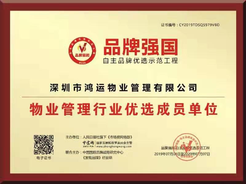 2019年7月,鴻運(yùn)物業(yè)協(xié)助國(guó)家發(fā)改委、人民日?qǐng)?bào)社,推動(dòng)品牌強(qiáng)國(guó)計(jì)劃、自主品牌優(yōu)選示范工程。鴻運(yùn)物業(yè)作為物業(yè)管理行業(yè)全國(guó)首家入圍品牌強(qiáng)國(guó)計(jì)劃,與支付寶、碧桂園、恒大集團(tuán)、格力等強(qiáng)勢(shì)占領(lǐng)稀缺性資源,緊跟國(guó)家政策推動(dòng)品牌戰(zhàn)略方針,謀跨越、促升級(jí)、破壁壘、猛崛起。