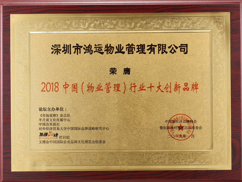 ?????? 2019年1月,鴻運(yùn)物業(yè)陳總受邀作為行業(yè)代表嘉賓,在北京人民大會(huì)堂參加2019中國(guó)新經(jīng)濟(jì)品牌峰會(huì)暨創(chuàng)新榜樣巡禮活動(dòng)會(huì)議,被現(xiàn)場(chǎng)授予2018中國(guó)(物業(yè)管理)行業(yè)十大創(chuàng)新品牌、2018中國(guó)創(chuàng)新先鋒企業(yè)的獎(jiǎng)?wù)拢员碚螟欉\(yùn)物業(yè)在中國(guó)物業(yè)行業(yè)上的創(chuàng)新投入。