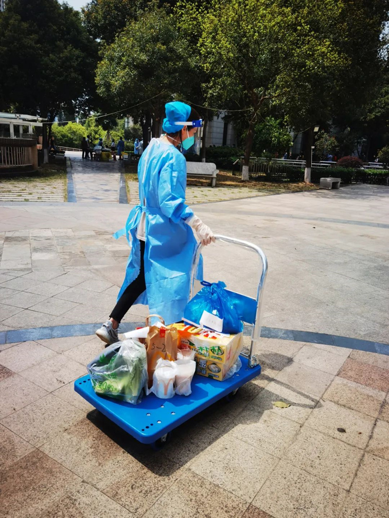 ? ? ? 時(shí)間緊任務(wù)重,精致的客服女孩們素面朝天,在完成本職工作后,也擼起袖子加入了送快遞的隊(duì)伍。到了飯點(diǎn),大家席地而坐匆匆吃完飯,又繼續(xù)忙碌。盛芳園是沙井街道最大的統(tǒng)建樓,占地面積89600㎡,共有1680戶,全小區(qū)的快遞和生活物資全部依靠政府和物業(yè)人員進(jìn)行配送,工作強(qiáng)度不言而喻。