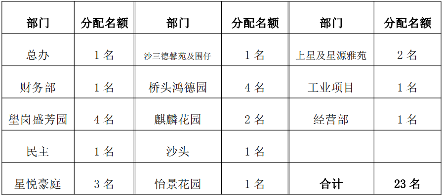 ????? 1、優(yōu)秀員工:23?名,并在優(yōu)秀員工中評選 3?人獲得“鴻運明星員工”稱號,在公司基層員工中選拔推薦,由各管理處內(nèi)部推選提交優(yōu)秀員工推薦表,經(jīng)公司審核通過公示無異議后產(chǎn)生;具體分配名額如下: