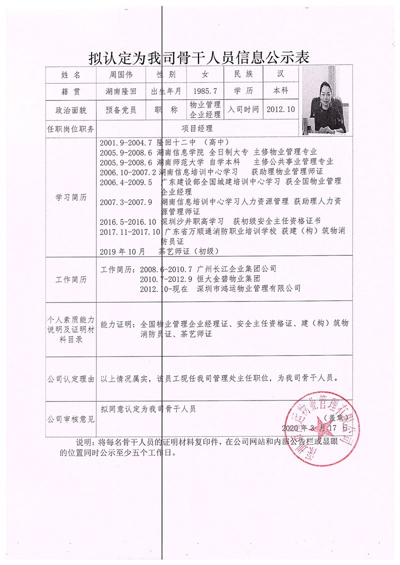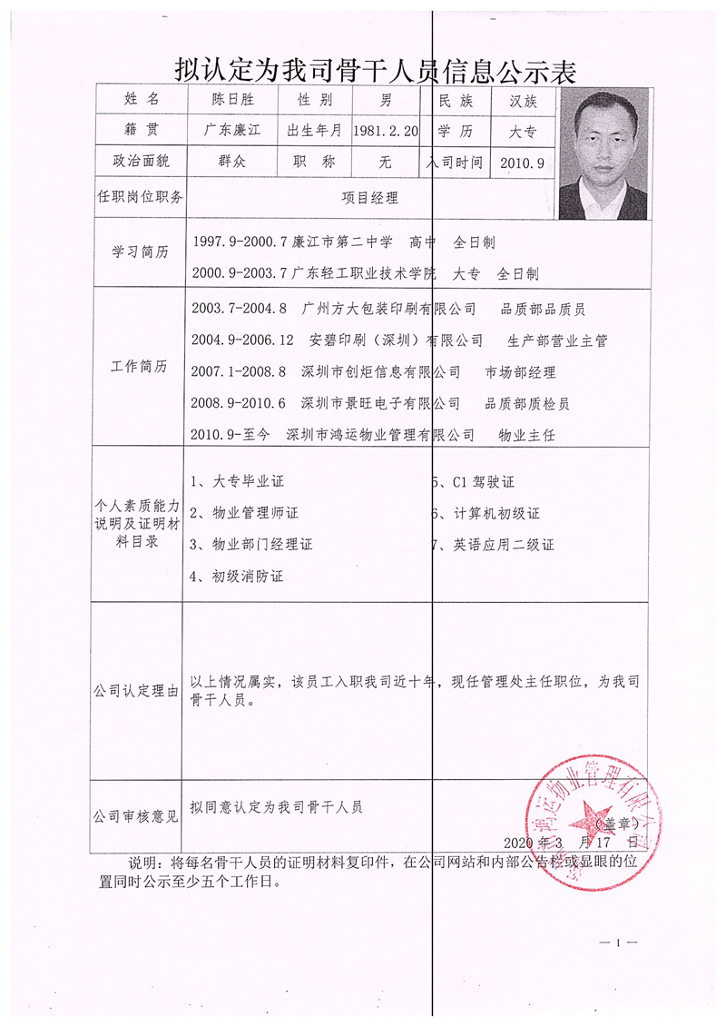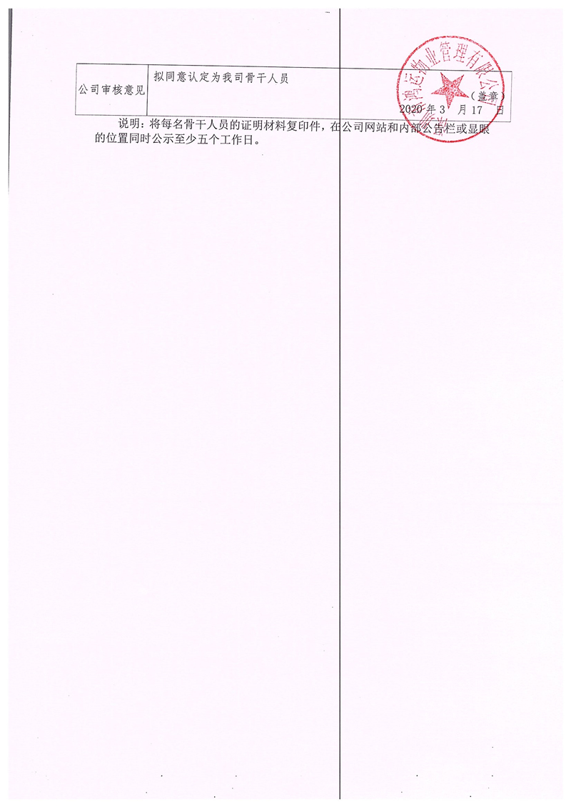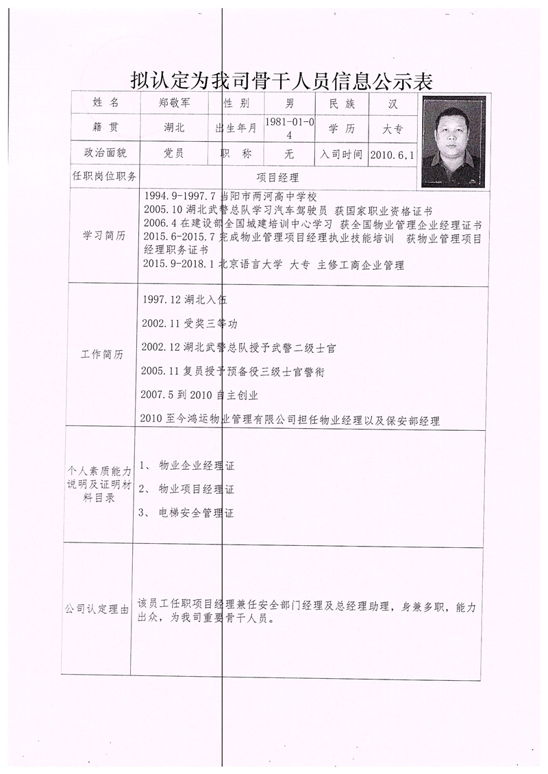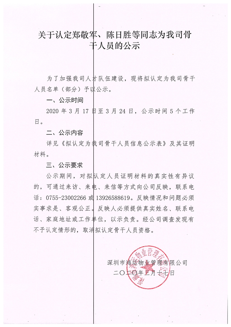 關(guān)于認(rèn)定鄭敬軍、陳日勝、周國(guó)偉同志為我司骨干人員的公示