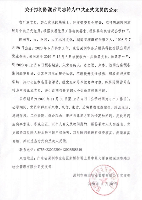 關(guān)于擬將陳瀾茜同志轉(zhuǎn)為中共正式黨員的公示